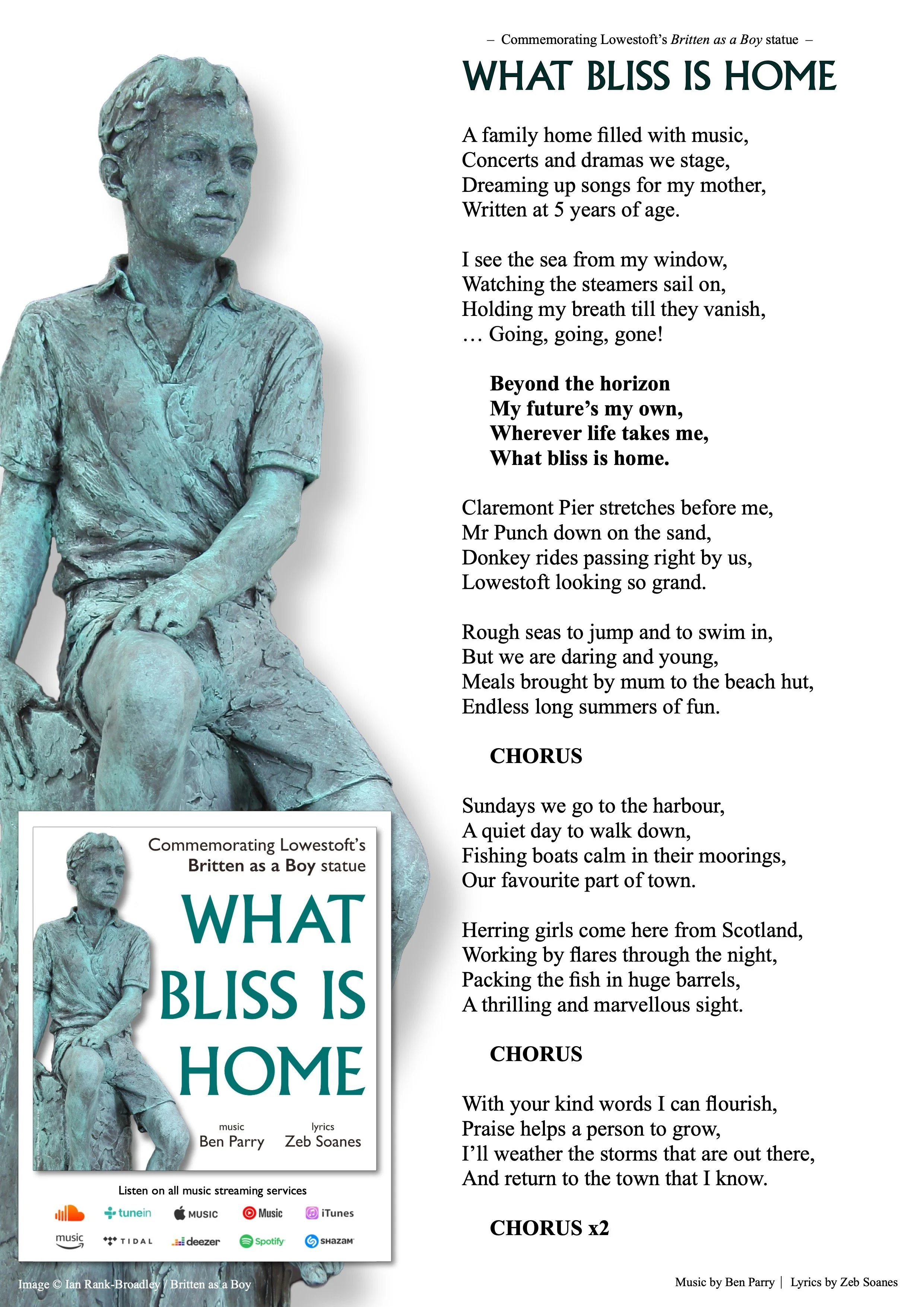 To commemorate the unveiling of the Britten as a Boy statue, this specially written song evokes Benjamin Britten’s childhood in Lowestoft. He wrote the words ‘What bliss is home’ in his diary when he was 15, expressing his deep love for his hometown.